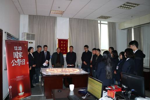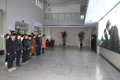 全体人员观看党和国家领导人在南京纪念馆举行的公祭仪式现场直播,为死难同胞默哀