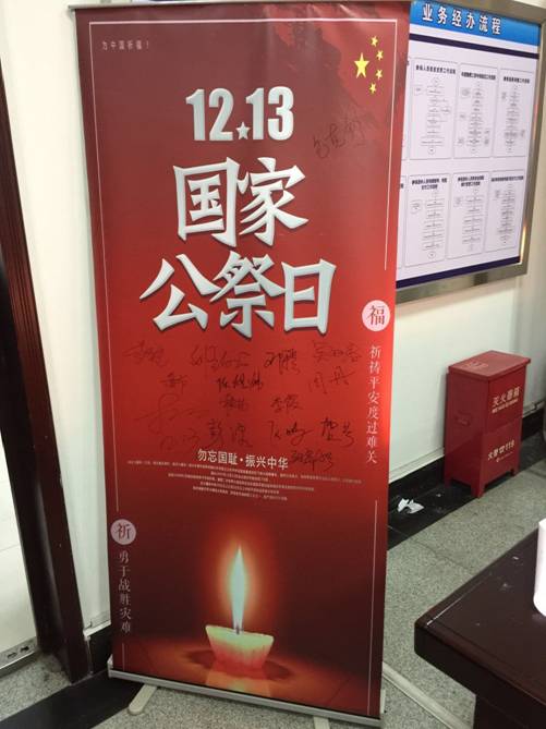 2017年12月13日,岳阳市机关事业单位养老保险管理处深化“五比五创”主题活动,创新“巴陵先锋党员活动日”载体,组织全体工作人员开展第四个国家公祭日纪念活动,市人社局党组成员、纪检组长李有星和市人社局机关党委副书记陈双平同志应邀出席。公祭仪式上,全体人员点燃蜡烛,肃默祈愿,共同悼念在南京大屠杀中的死难同胞。处党支部书记、处长刘贡献同志为活动致辞,要求全体人员不忘国耻,不忘历史,在党的十九大精神指引下,立足本职岗位,发奋努力工作,为实现中华民族伟大复兴的中国梦作出应有贡献。仪式后,参加活动人员观看了党和国家领导人在南京纪念馆举行的公祭仪式,并依次在国家公祭日宣传海报上签名。大家纷纷表示受到了一次深刻的爱国主义教育,更为深切的体会到了国家统一强大的重要,今后将会铭记历史,不忘国耻,珍爱和平。